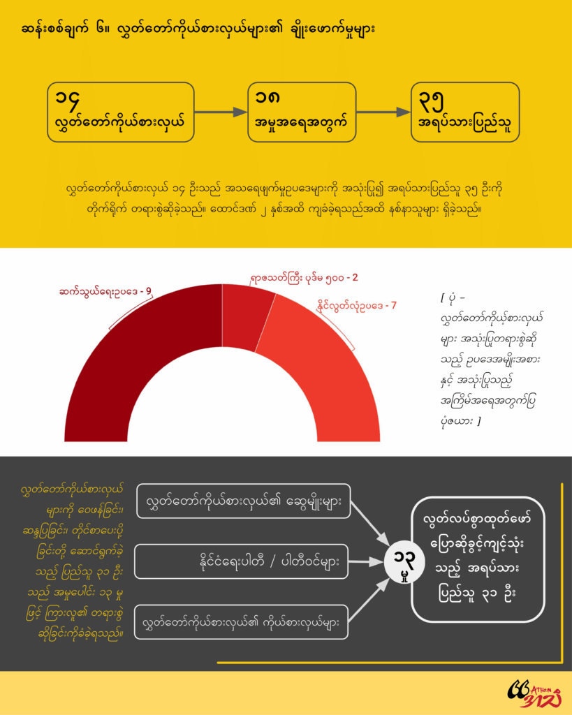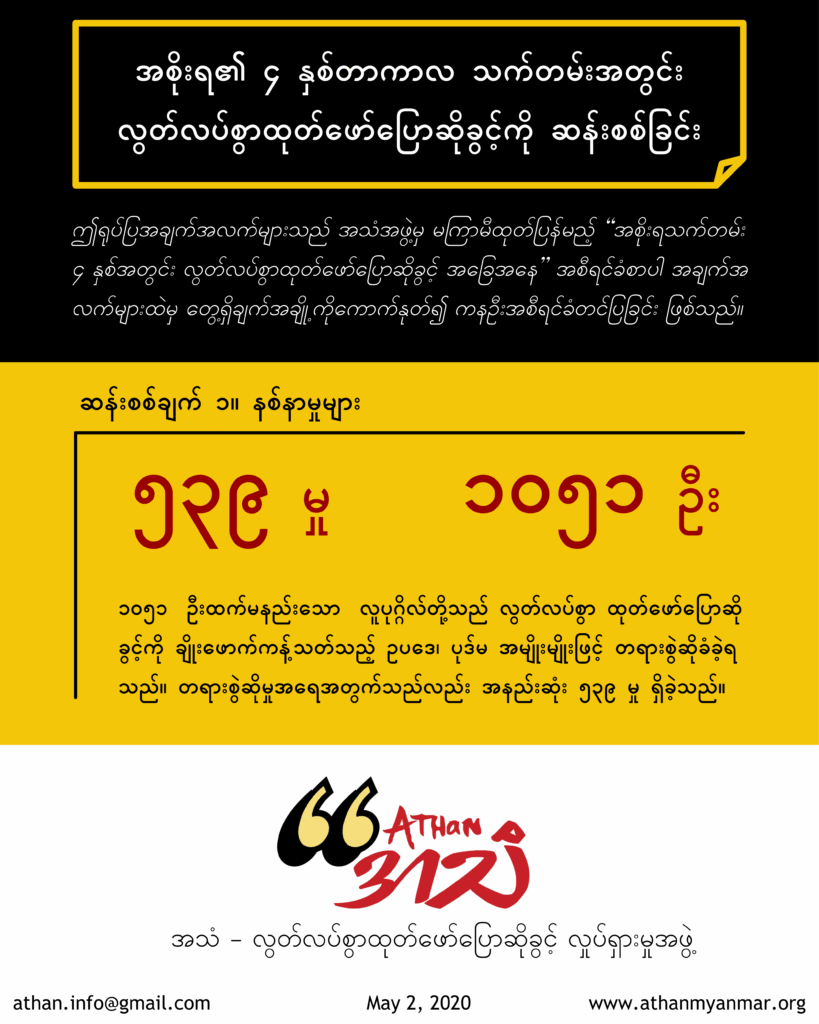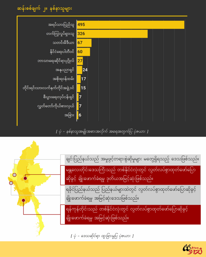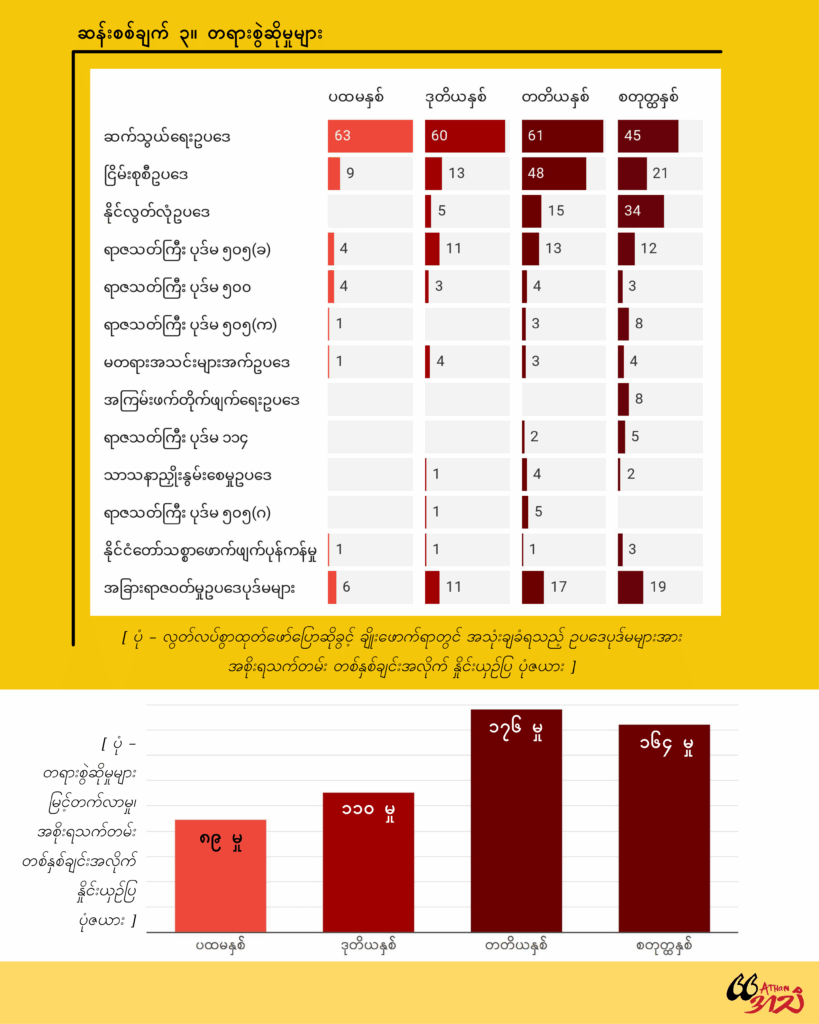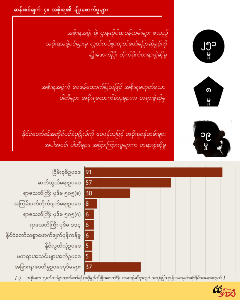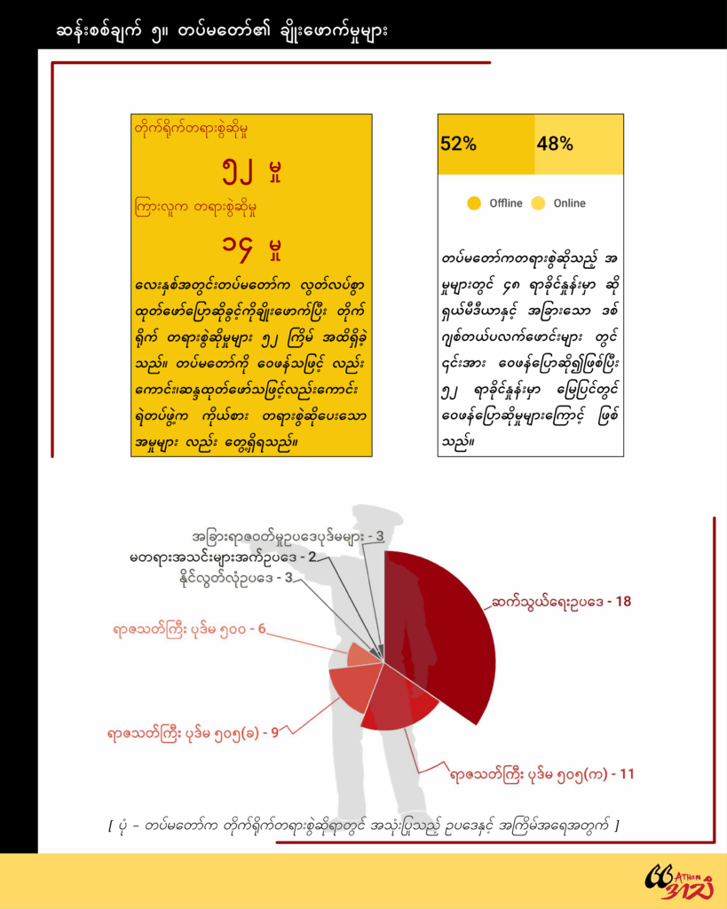 ဤရုပ်ပြအချက်အလက်များသည် အသံအဖွဲ့မှ မကြာမီထုတ်ပြန်သည့် “အစိုးရသက်တမ်း ၄ နှစ်အတွင်း လွတ်လပ်စွာထုတ်ဖော်ပြောဆိုခွင့် အခြေအနေ” အစိုးရင်ခံစာပါ အချက်အလက်များထဲမှ တွေ့ရှိချက်အချို့ကိုကောက်နုတ်၍ ကနဦးအစီရင်ခံတင်ပြခြင်းဖြစ်သည်။